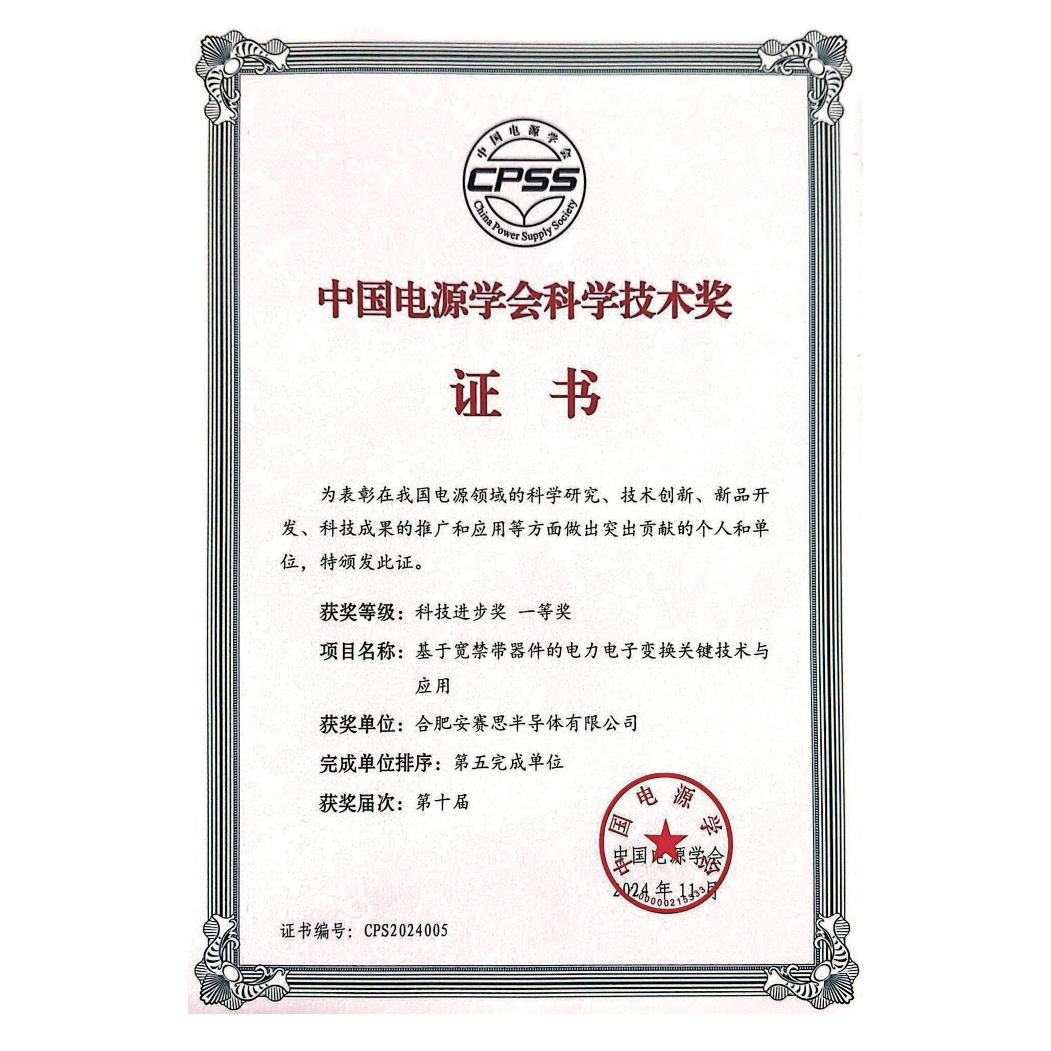 中国电源学会科技进步奖一等奖